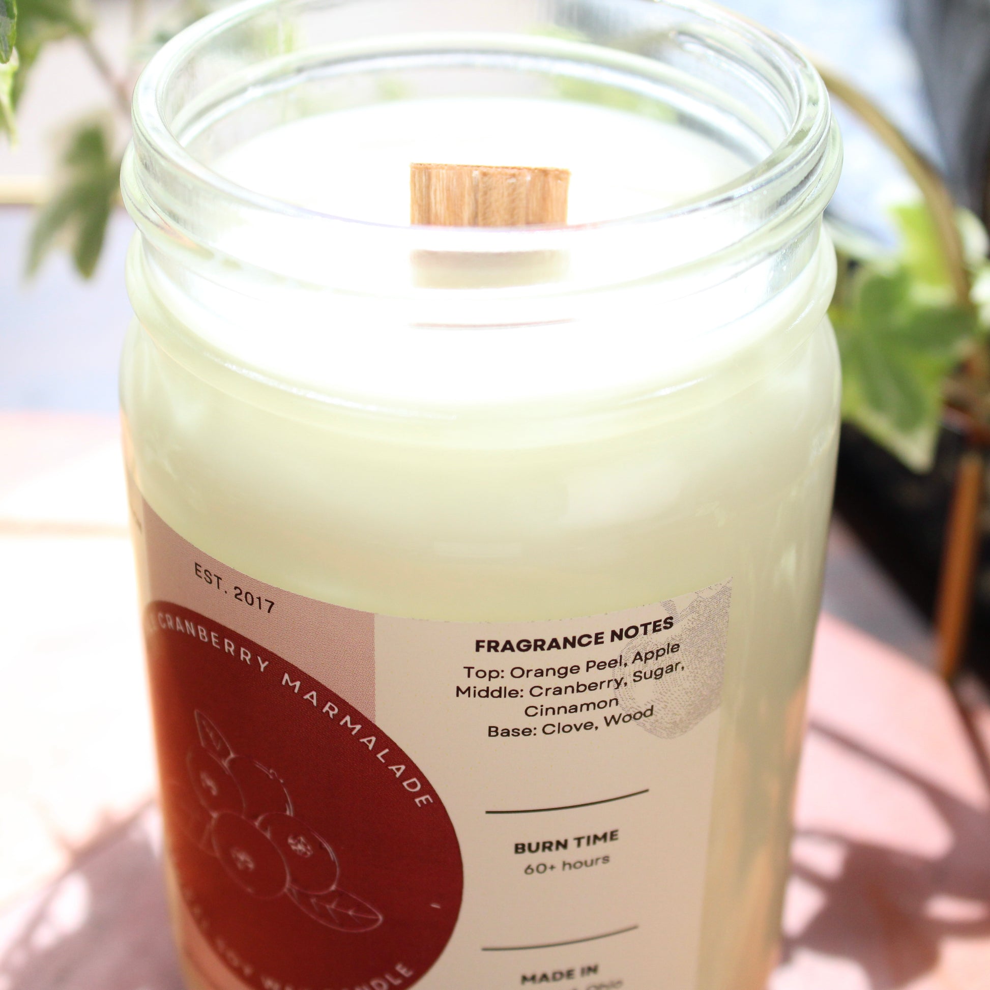 Our Apple Cranberry Marmalade is a perfect blend of tart cranberries, fresh applies and spice. It has hints of clover, cinnamon, and sugar which make it the perfect fruity scent for the holiday season, or year round. Our signature scented candle is made from all natural soy wax, which is eco-friendly, and made using wooden wicks. By using wooden wicks, they are able to burn clean and have a better scent throw throughout your home. They can also make a peaceful crackling sound when lite. Any fragrance we use is also phthalate free from CandleScience. Our candles can add a great touch to any room in your home!