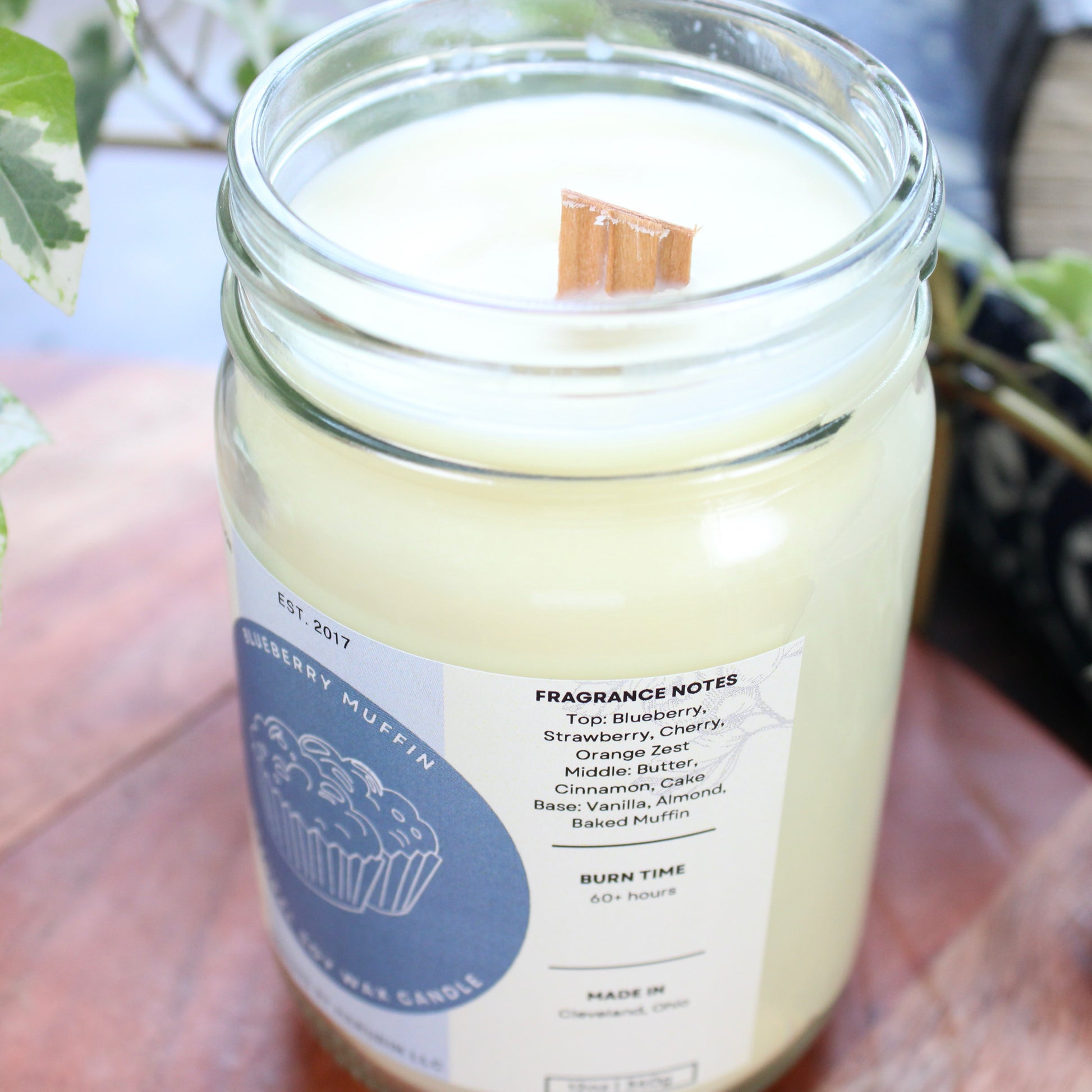 Our Blueberry Muffin scented candle smells just like a freshly baked blueberry muffin.Top notes of juicy tart blueberries with orange zests, middle notes of butter cake, and base notes of vanilla and almond. Our signature scented candle is made from all natural soy wax, which is eco-friendly, and made using wooden wicks. By using wooden wicks, they are able to burn clean and have a better scent throw throughout your home. They can also make a peaceful crackling sound when lite. Any fragrance we use is also phthalate free from CandleScience. Our candles can add a great touch to any room in your home!