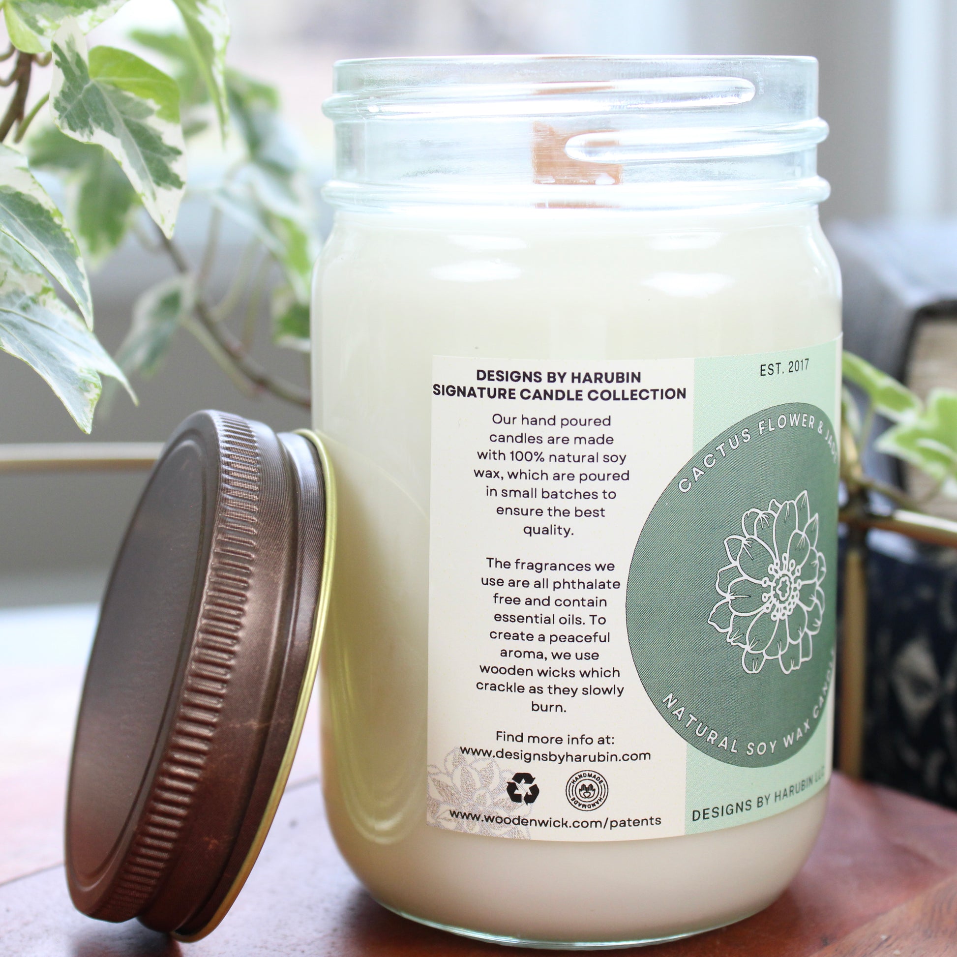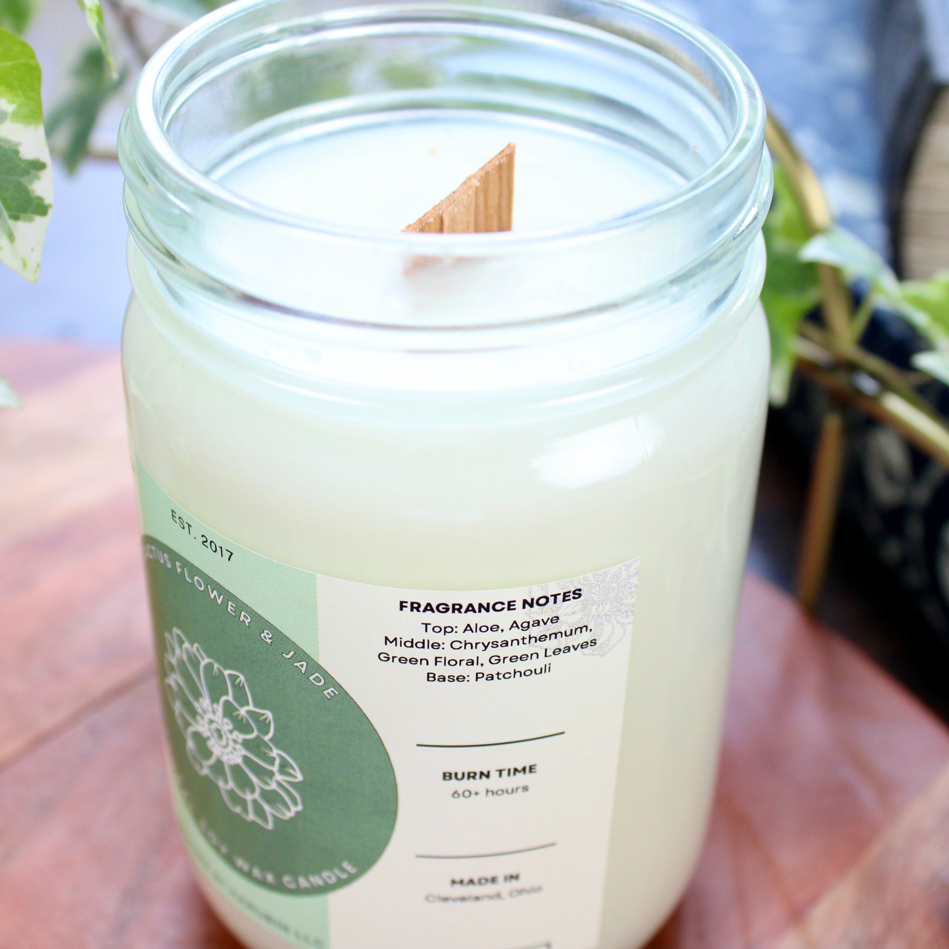 This Cactus Flower and Jade scented candle is a lively fragrance that combines a floral spring scent with the scent of fresh cut green leaves that gives it a very natural aroma. Our signature scented candle is made from All Natural Soy Wax, which is eco-friendly, and made using wooden wicks. By using wooden wicks, they are able to burn clean and have a better scent throw throughout your home. They can also make a peaceful crackling sound when lite. Any fragrance we use is also phthalate free from CandleScience. Our candles can add a great touch to any room in your home!