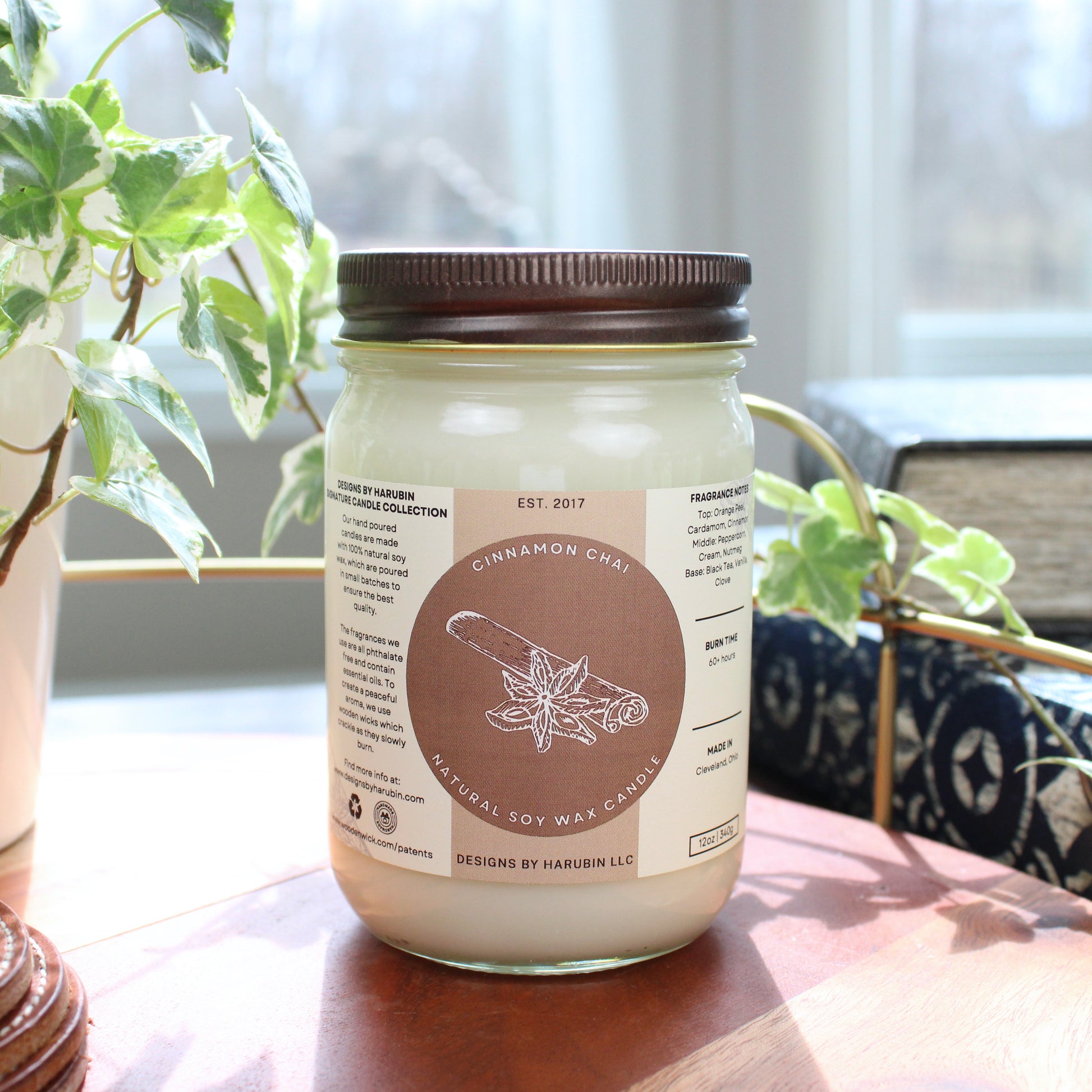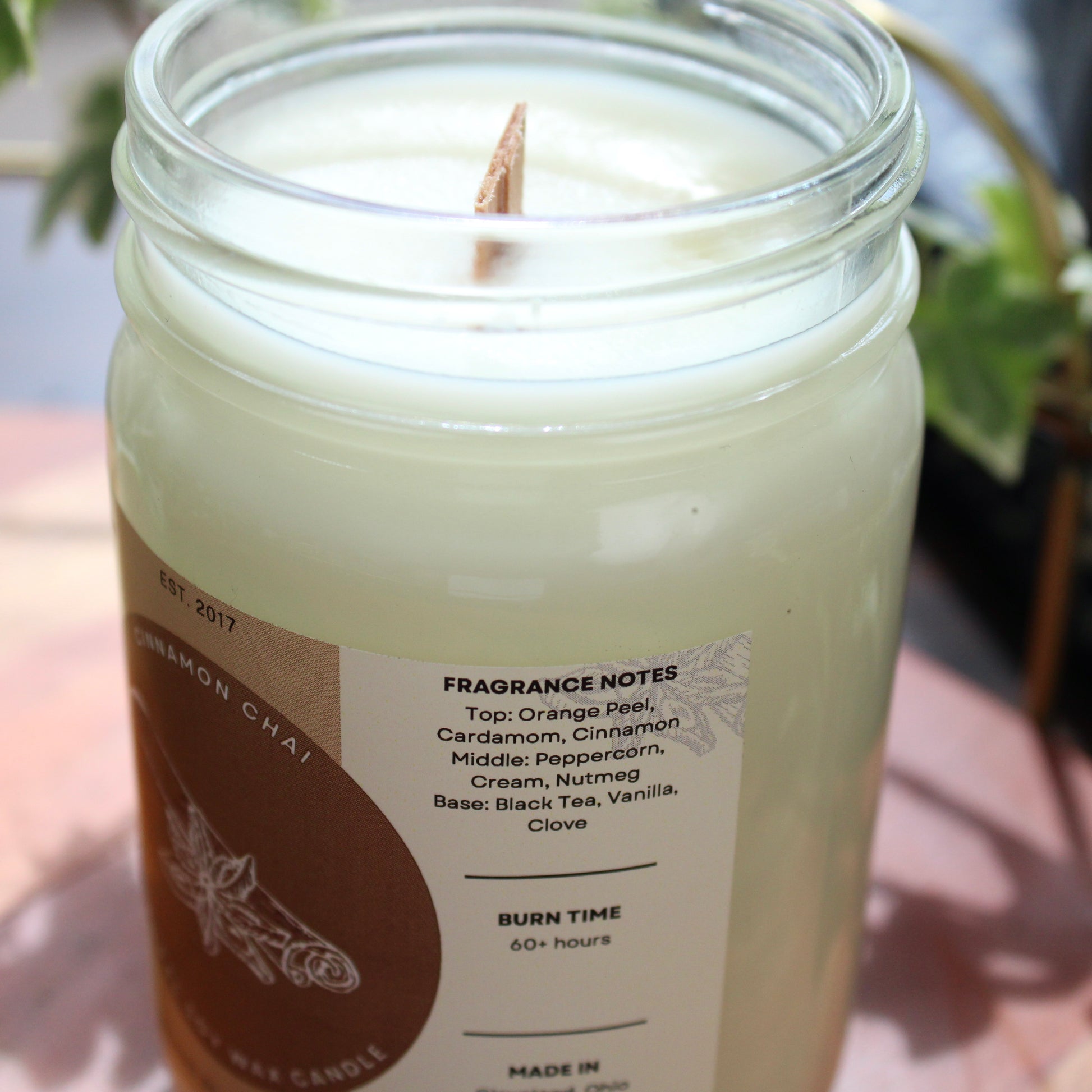 Our Cinnamon Chai scented candle is a blend of cinnamon, sweet vanilla, cardamom, orange peel and black tea; which gives the fragrance a warm and inviting feeling that is perfect for the fall or even year round. Our signature scented candle is made from all natural soy wax, which is eco-friendly, and made using wooden wicks. By using wooden wicks, they are able to burn clean and have a better scent throw throughout your home. They can also make a peaceful crackling sound when lite. Any fragrance we use is also phthalate free from CandleScience. Our candles can add a great touch to any room in your home!