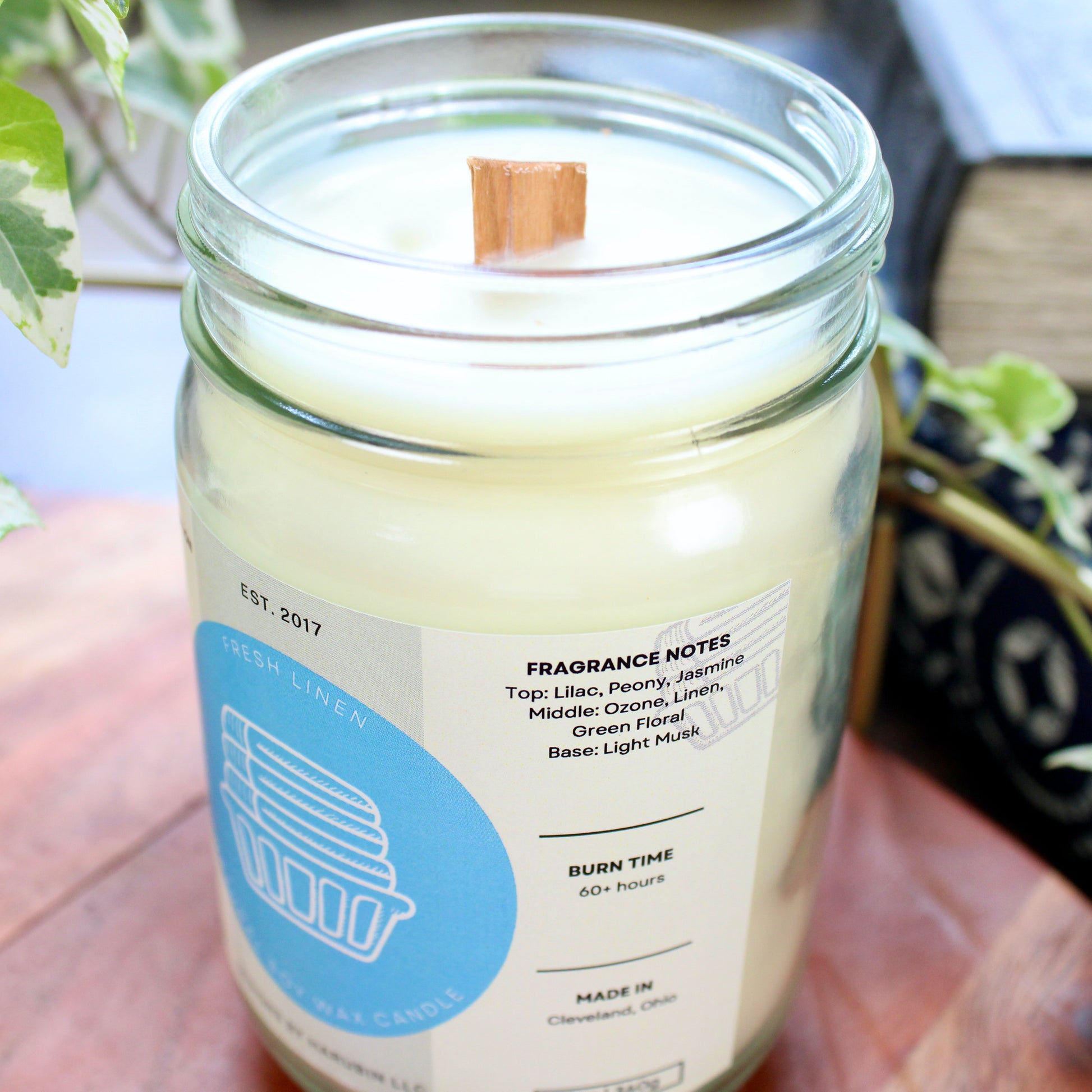 Our Fresh Linen scented candle smells just like fabric softener. It is a clean scent with soft subtle back notes of powder and musk. Our signature scented candle is made from all natural soy wax, which is eco-friendly, and made using wooden wicks. By using wooden wicks, they are able to burn clean and have a better scent throw throughout your home. They can also make a peaceful crackling sound when lite. Any fragrance we use is also phthalate free from CandleScience. Our candles can add a great touch to any room in your home!