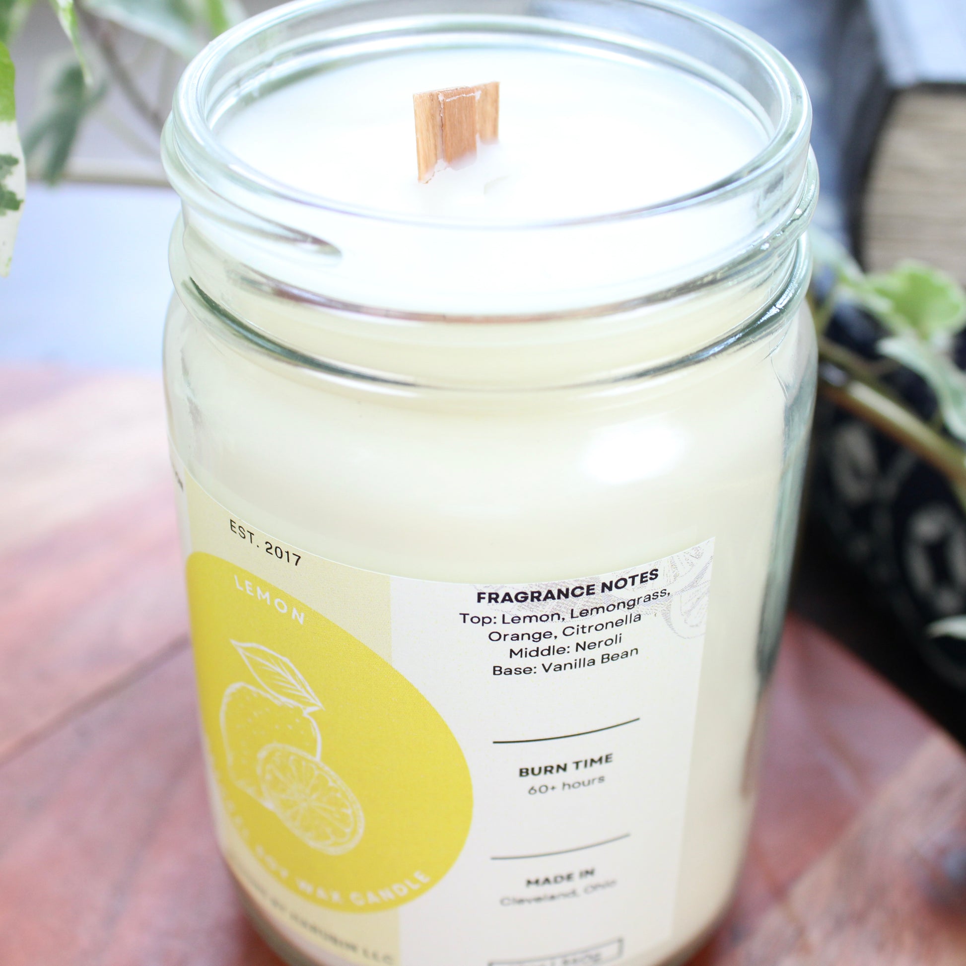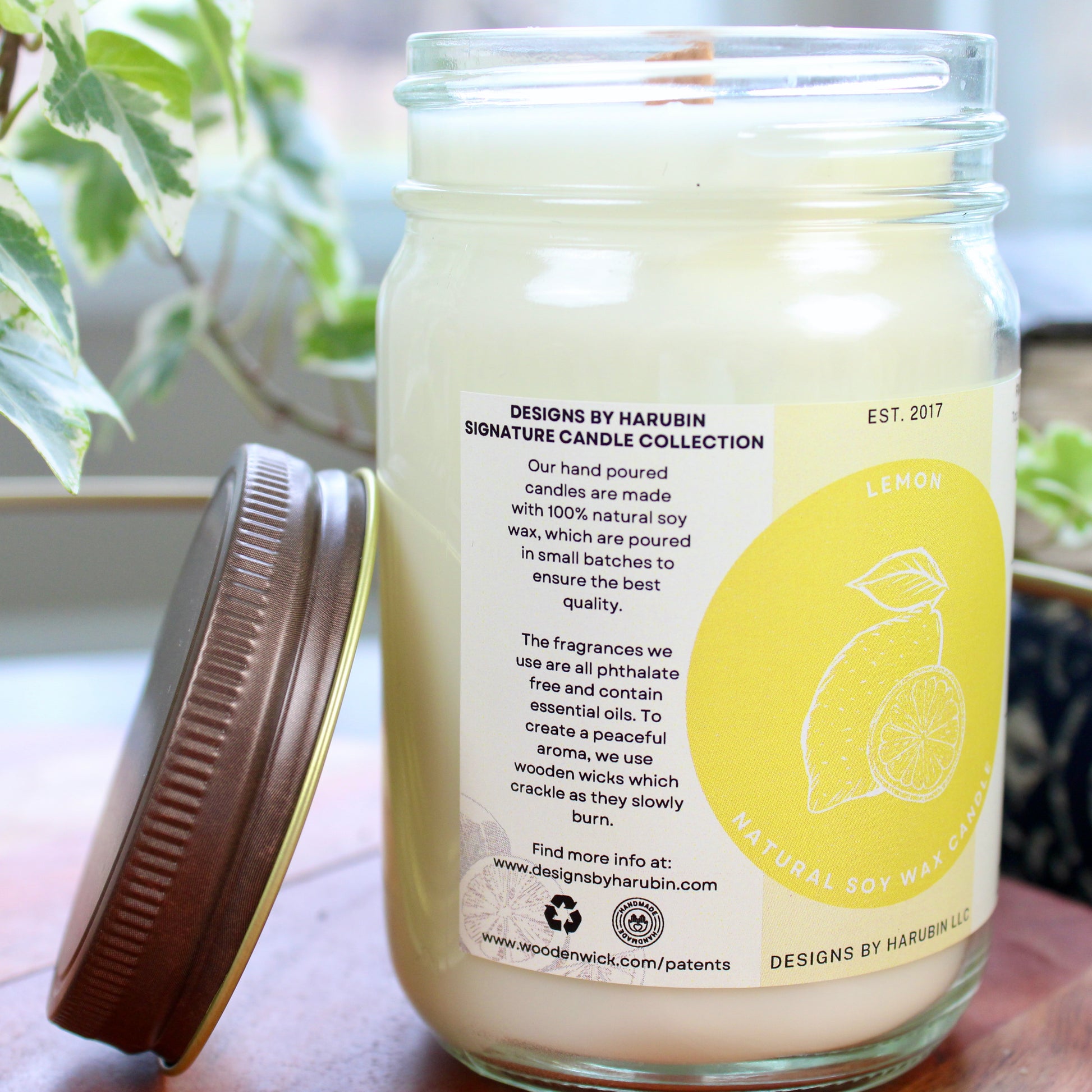 Our Lemon scented candle gives off the perfect aroma of a freshly squeezed juicy lemon. Our signature scented candle is made from all natural soy wax, which is eco-friendly, and made using wooden wicks. By using wooden wicks, they are able to burn clean and have a better scent throw throughout your home. They can also make a peaceful crackling sound when lite. Any fragrance we use is also phthalate free from CandleScience. Our candles can add a great touch to any room in your home!