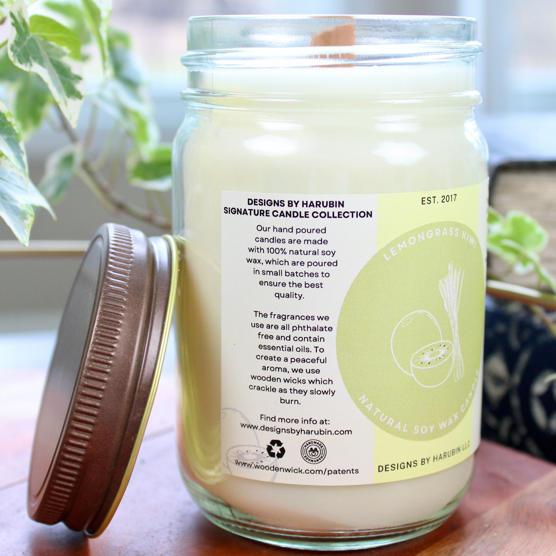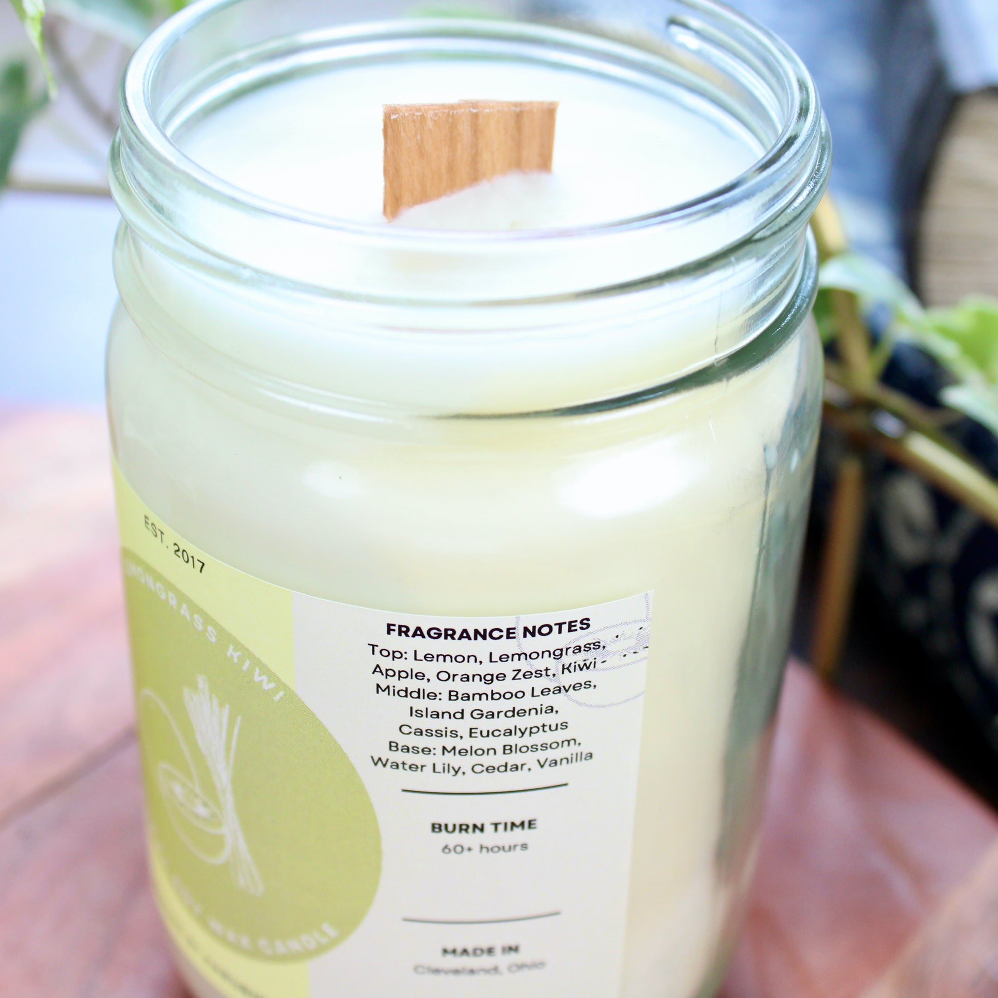 Our Lemongrass Kiwi scented candle is a wonderful aroma of fresh cut lemongrass with a hint of green herbal notes. Our signature scented candle is made from all natural soy wax, which is eco-friendly, and made using wooden wicks. By using wooden wicks, they are able to burn clean and have a better scent throw throughout your home. They can also make a peaceful crackling sound when lite. Any fragrance we use is also phthalate free from CandleScience. Our candles can add a great touch to any room in your home!