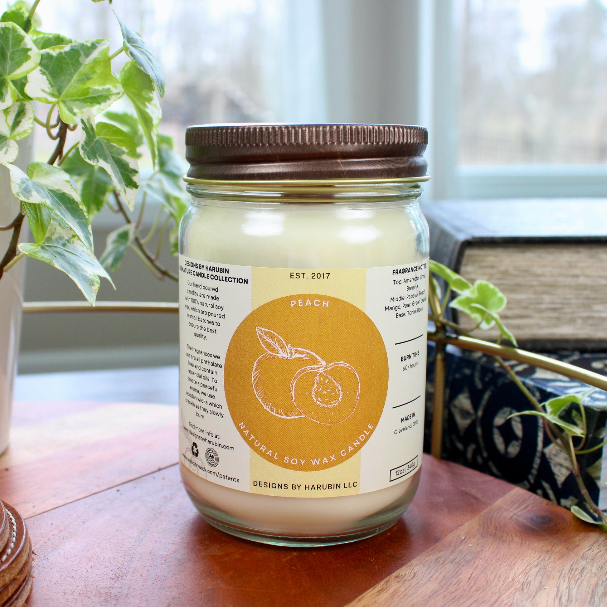 Our Peach soy candle is a blend of fresh peach and other tropical scents, such as: Mandarin, Coconut, and Plum. Our signature scented candle is made from all natural soy wax, which is eco-friendly, and made using wooden wicks. By using wooden wicks, they are able to burn clean and have a better scent throw throughout your home. They can also make a peaceful crackling sound when lite. Any fragrance we use is also phthalate free from CandleScience. Our candles can add a great touch to any room in your home!