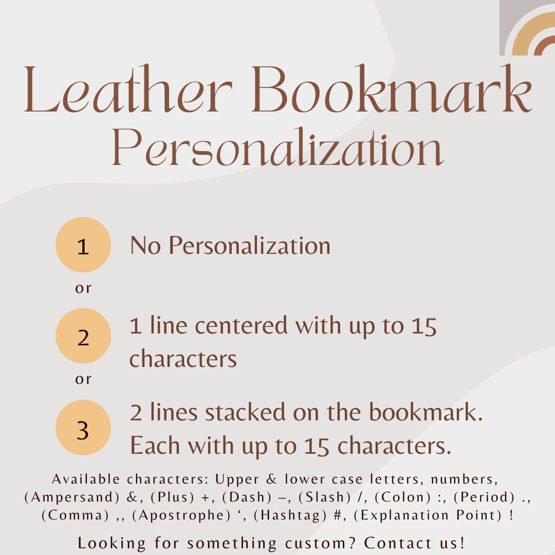 -We are able to stamp your bookmark with up to 15 characters on 1 line in the middle of the bookmark OR 2 lines on the bookmark with 15 characters on each line.