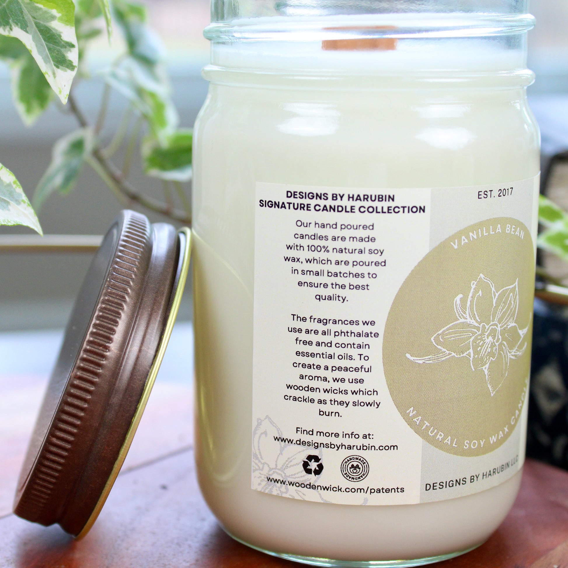 This Vanilla Bean scented candle has a rich scent of vanilla along with a hint of cream that gives it a smooth aroma. Our signature scented candle is made from all natural soy wax, which is eco-friendly, and made using wooden wicks. By using wooden wicks, they are able to burn clean and have a better scent throw throughout your home. They can also make a peaceful crackling sound when lite. Any fragrance we use is also phthalate free from CandleScience. Our candles can add a great touch to any room in your home!