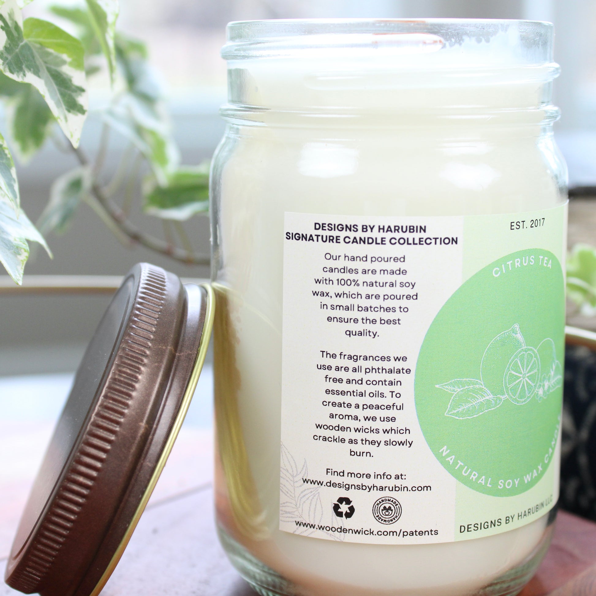 Our Citrus Tea blends mandarin and lemongrass amplified by mid notes of bergamot and ginger steeped in a base of white tea and jasmine. Our signature scented candle is made from all natural soy wax, which is eco-friendly, and made using wooden wicks. By using wooden wicks, they are able to burn clean and have a better scent throw throughout your home. They can also make a peaceful crackling sound when lite. Any fragrance we use is also phthalate free from CandleScience. Our candles can add a great touch to any room in your home!